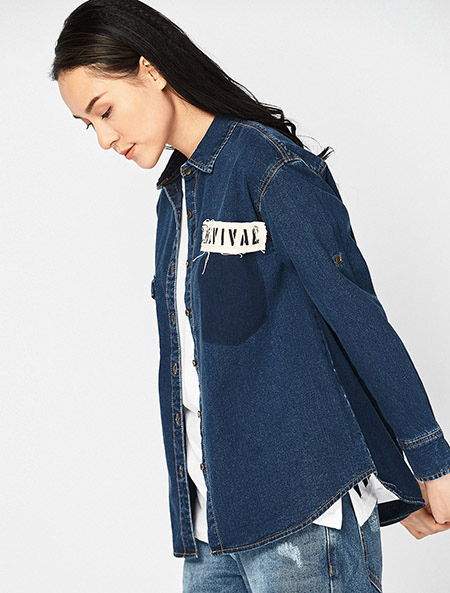 - Sơ mi denim nữ, túi ốp ngực, gắn chữ